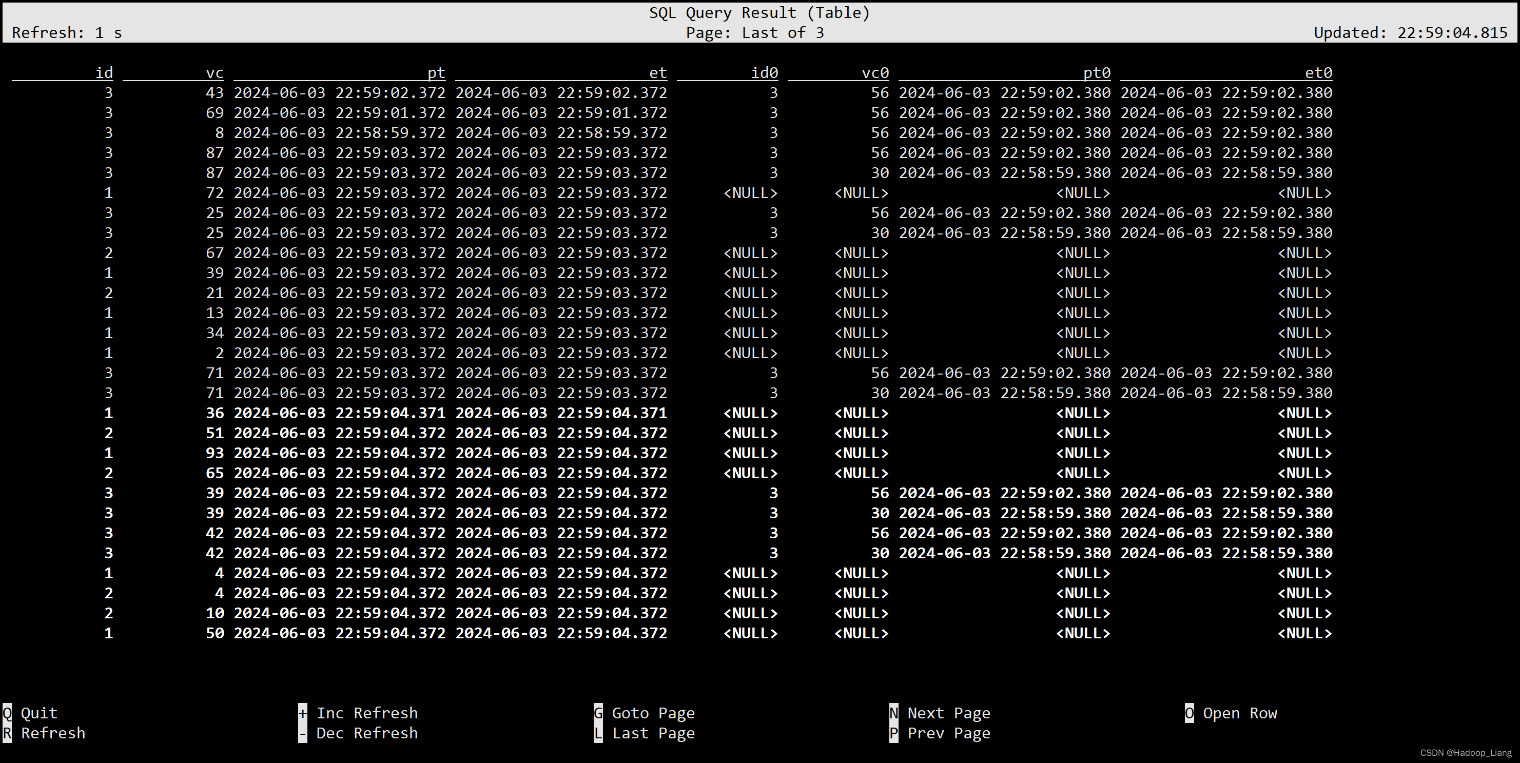 Flink SQL> SET sql-client.execution.result-mode=tableau; [INFO] Execute statement succeed. Flink SQL> SELECT 'Hello World', 'It''s me'; ... 省略若干日志输出 ... +----+--------------------------------+--------------------------------+ | op | EXPR$0 | EXPR$1 | +----+--------------------------------+--------------------------------+ | +I | Hello World | It's me | +----+--------------------------------+--------------------------------+ Received a total of 1 row