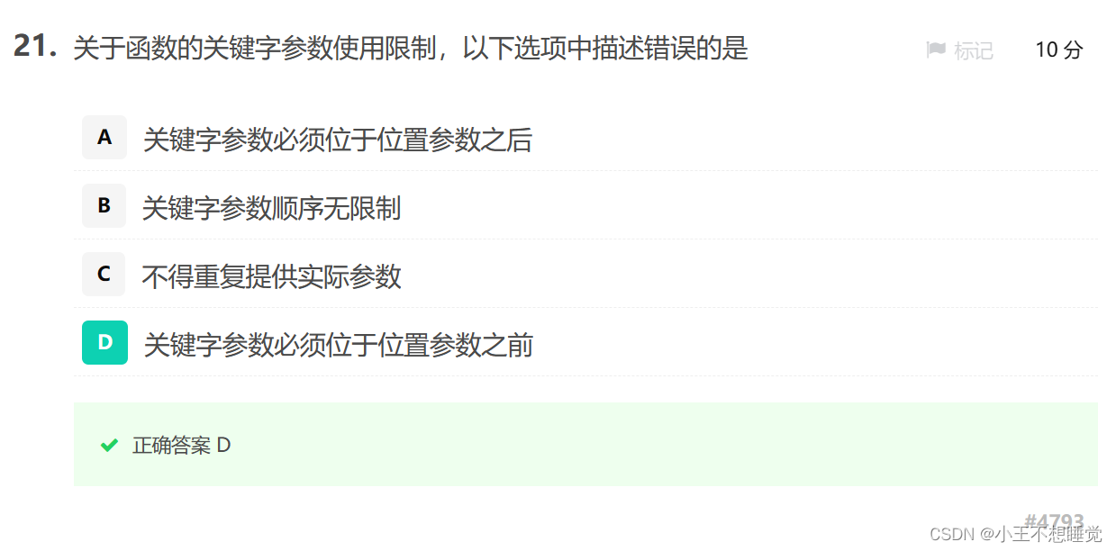 答案解析:A选项f(1, y = 2, t = 3)中,并无t参数;B选项,第一个使用关键字参数后面的也需要使用关键字参数;C选项,位置参数错误。关键字传参,用形参的名字来传入实参的方式,传参顺序就可和定义顺序不同