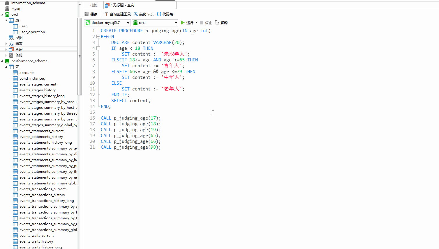 注意:笔者这里使用的是 navicat 和 mysql5.7.25 版本,如果读者使用的是 mysql 命令行客户端,需要使用 DELIMITER $$ 定义结束符,因为上边语句中的 ";" 会被mysql 命令行客户端识别为结束符,因此在有";"的函数体中,需要读者额外定义结束符,如下面代码