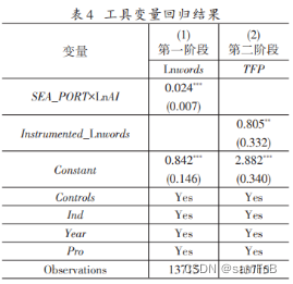本文进一步采用工具变量来缓解可能存在的内生性问题。基于清朝通商的历史事件构造企业人工智能的工具变量,具体工具变量的处理及合理性说明如下:参考范等(2013)、林建浩和赵子乐(2017)以及蔡贵龙等(2018),我们采用 1840 年至清朝末期该城市是否开设通商口岸(SEA_PORT)构建工具变量。一个城市是否曾经作为通商口岸可能影响当地企业技 术的应用,而不会直接影响现阶段当地企业的生产效率,因此该变量满足工具变量的相关性和外生性条件。具体地,企业所在城市自 1840 年至清朝末期被开设为通商口岸则定义 SEA_PORT 为 1,否则为 0。